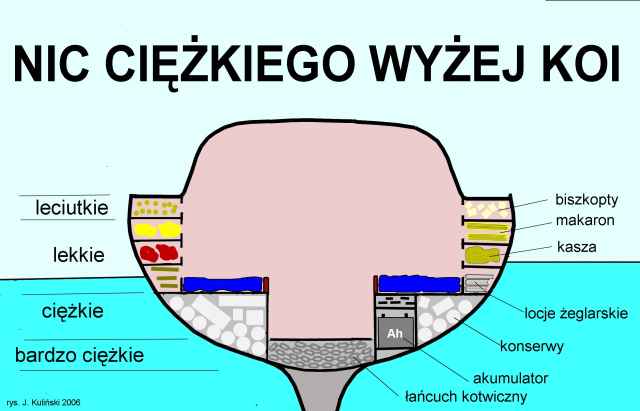 Uprzedzam - zakupy, transport i sztauowanie to ciężka praca dla minimum 2 silnych i sprawnych. Aby zasztauować aprowizację trzeba pamiętać, że wszystko poniżej poziomu koi bardzo upośledza statecznosc małej łódki. A więc to, co ciężkie - umieszczacie jak najniżej. To co najczęsciej potrzebne - bliżej kambuza, To takie oczywiste oczywistości, czyli odkrywanie tego co niby wszyscy wiedzą.