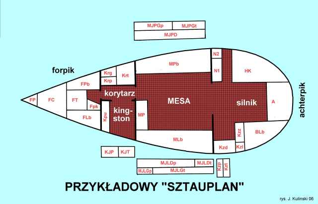 Koniecznym będzie sporządzenie "sztauplanu", aby w czasie rejsu poszukiwania wiktuałów zredukować do minimum. "Sztauplan" powinien być wklejony taśmą samoprzylepną do wewnętrznej, tylnej okładki Dziennika Jachtowego. Oprócz sztauplanu w roboczym zeszycie wpiszecie nazwy, ilości poszczególnych produktów żywnościowych i symbol pomieszczenia ze "sztauplanu". Podczas pobierania - aktualizujecie zapisy zapasów. Pamiętajcie, że słoiki muszą być owinięte polietylenową folią z bąbelkami. Żadnych torebek papierowych ! Tylko pojemniki i pojemniczki.
