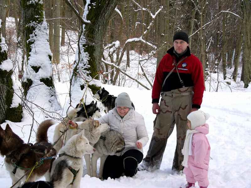 Na początku nastąpił pokaz ustawiania psiego zaprzęgu: „Szary” – psi przewodnik wpinany jest najpierw solo na czoło zaprzęgu, a potem pieski dobrane parami. Razem 13 sztuk. Żona z córką usiadły w pierwszych sankach prowadzonych przez Roberta, a ja miałem zostać maszerem drugich.
