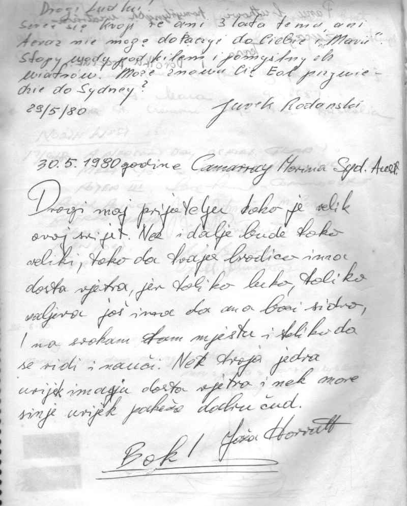 Teraz niestrudzony Wojek Jacobson, twórca pięknego albumu „Mam na imię Ludmir”, kustosz wielu pamiątek po Ludku, odkrył ten wpis, który był dokonany 30 maja 1980, podczas postoju MARII w Cameray Marina w Sydney i zamierza go wykorzystać do kolejnego popularyzatorskiego przedsięwzięcia...W jaki sposób Horvat znalazł się wtedy w Sydney – nie wiem, ale widać zdecydowanie żeglarski charakter ich kontaktu.