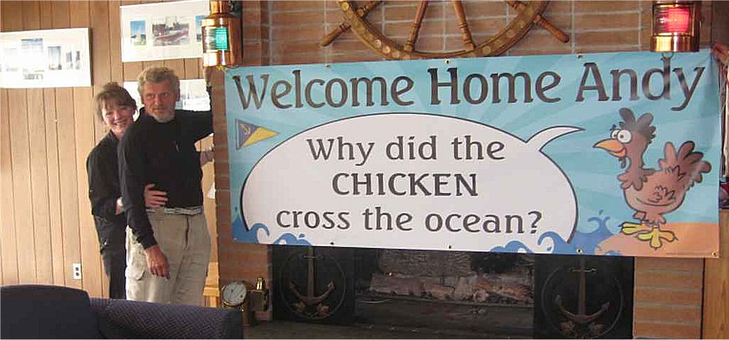 Andrzej Lepiarczyk, na swoim zolciutkim kurczaku - czyli jachcie MIGHTY CHICKEN pojawil sie w sobote 16 maja, dokladnie o umowionej godzinie, w swoim macierzystym West Vancouver Yacht Club. Cumy odbieral jego przyjaciel jeszcze z czasow szkolnych w Polsce Jacek Kromka. W gronie witajacych byla zona Michele (rodowita Kanadyjka), kilku przyjaciol zeglarzy, ekipa miejscowej TV i reporter z gazety "Vancouver Sun". Slusznie ktos z ladu skrzyknal tych pare osob bo wedlug samego Andrzeja zadnego takiego spotkania by nie bylo.
