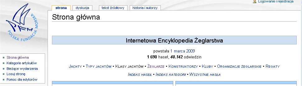Przejrzałem - fakt, że pobieżnie - Internetową Encyklopedię Żeglarstwa. Nie bardzo rozumiem czemu ten projekt ma służyć (poza promowaniem Polskiej Fundacji Morskiej), bowiem nie tylko oprogramowanie pochodzi z projektu wiki. Większość haseł z których treścią się zapoznałem to kopia z http://pl.wikipedia.org - K. Baranowski, K. Jaworski, Cz. Marchaj .. (w tym nawet większość biogramów członków Rady Programowej PFM). Skopiowane z wikipedii artykuły są pozbawione większości odnośników i fotografii - co zubaża ich treść.