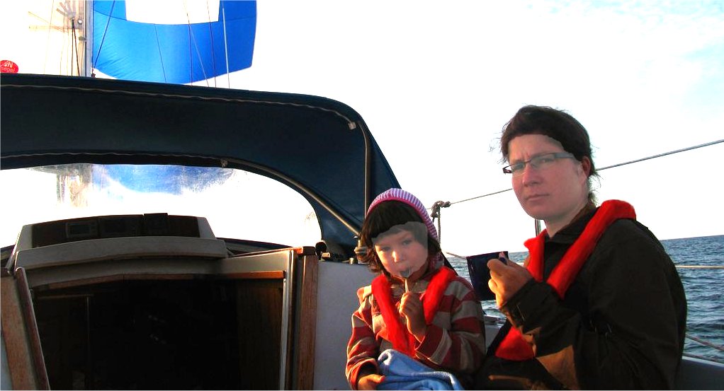 Dalej ruszamy w sobotę 1 sierpnia. Morze gładkie, niestety mało też wieje. Płyniemy początkowo na silniku. Po 1600 zaczyna wiać ze wschodu. Spinaker w górę i po godzinie mamy już 4,5 w na liczniku. Postanawiamy obrać kurs na Nexo. O zachodzie morze cały czas gładkie, ale robimy już 6,5 w! Na noc zrzucam spinakera, na foku łatwiej manewrować gdyby trzeba było kogoś omijać. W nocy suniemy 5,5w na samym foczku. Płyniemy na skraju ławicy Słupskiej – nikogo nie spotykamy. Rano jesteśmy jesteśmy Nexo. Decyzja udana, na dłuższe przeloty z dziećmi warto wybierać noc – nie mają kiedy się nudzić :)
