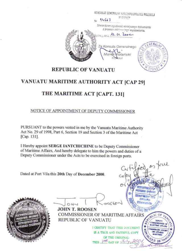 1. Padło jedno pytanie o moją wiarygodność. W związku z tym wysyłam Panu kopie dokumentu o powołanie mnie na stanowisko Zastępcy komisarza ds. morskich Republiki Vanuatu, uwierzytelnioną przez Departament Spraw Zagranicznych Republiki Vanuatu oraz Konsulat Rzeczypospolitej Polski w Sydnej, Australia. Wiarygodność tego dokumentu można sprawdzić w Vanuatu Maritime Authority (Urząd Morski Vanuatu), Department of Foreign Affairs, Republic of Vanuatu (Departament Spraw Zagranicznych Republiki Vanuatu) oraz w Konsulacie Rzeczypospolitej Polski w Sydnej.