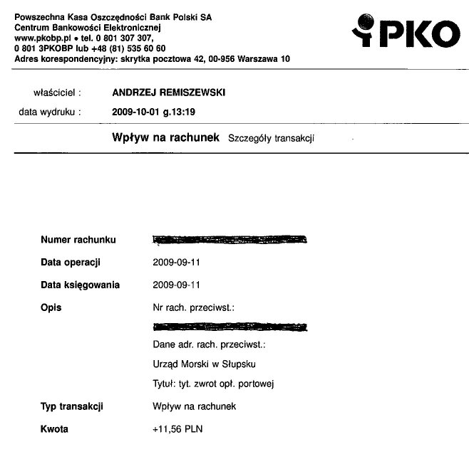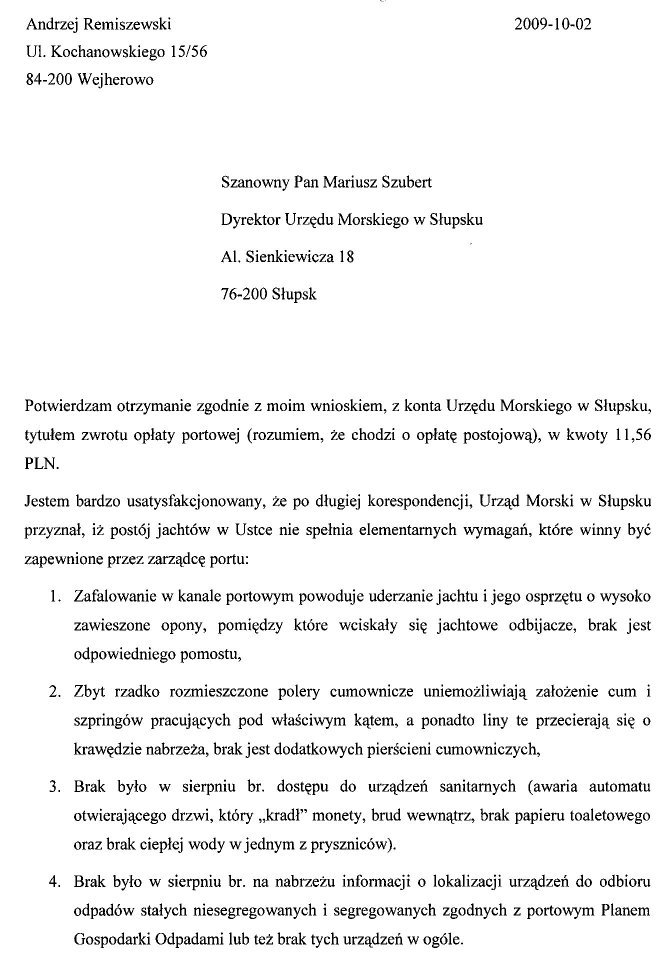 Załączam finalne pismo dyskusji z Urzędem Morskim w Słupsku na temat opłaty portowej oraz skan przelewu wydrukowanego dopiero wczoraj. Urząd nie potrafil przyznać na piśmie mi racji ale dokonał operacji finansowej to potwierdzającej, wszak bez decyzji Dyrektora Szuberta księgowośc pzelewu wykonać by nie mogła. Urząd także nie odpwiedział na dwukrotnie zadane pytanie o organ odwoławczy. Trudno, rozumiem, że im niełatwo przyznać się do "winy". Tymbardziej się cieszmy.