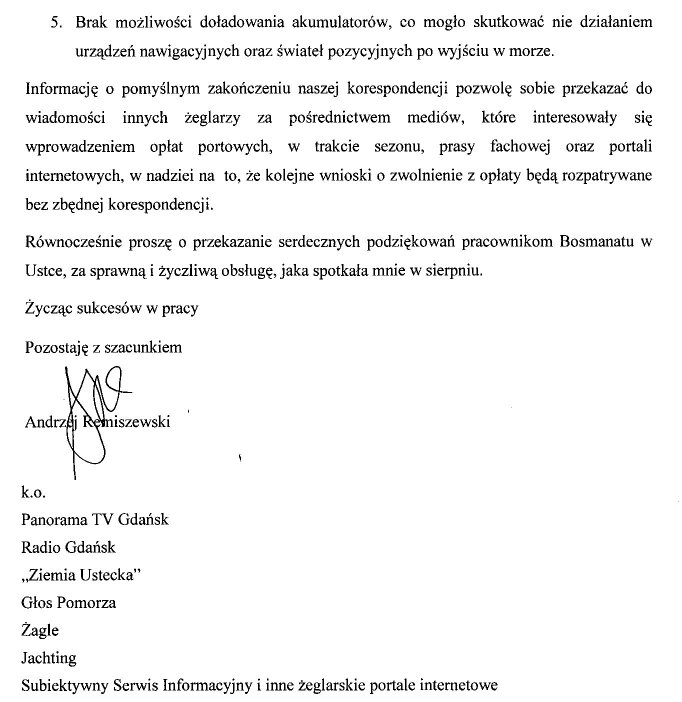 Uważam, że wiosną, tuż przed sezonem należy dokonać wizji lokalnej na miejscu w Ustce i jeśłi sytuacja nie ulegnie poprawie, opublikować wzorcowy wniosek do Dyrektora o zwolnienie z oplaty postojowej, tak by każdy mógl go sobie wydrukowac i złożyć od razu podczas opłacania postoju w Bosmanacie za potwierdzeniem odbioru.