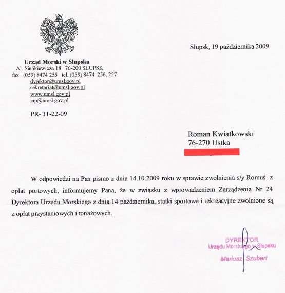Co Wam będę komentował pismo Urzędu Morskiego w Słupsku - adresowane do Naszego Człowieka w Ustce - Romana Kwiat Kwiatkowskiego. Sami poczytajcie i zastanówcie się nad jego wymową.