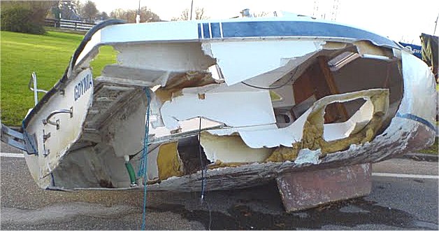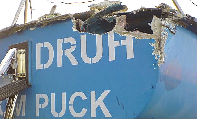 Puck-krajobraz po bitwie już jako tako ogarnięty. Pomosty pozbierane, jachty powyciągane. Tylko duż ilości trawy morskiej przypominają o tym co sie tu działo.Uwagę żeglarzy przyciągają uszkodzenia jachtów - Nefryta z HOM-u i ... ... Conrada 600 który został wciśniety między dwa pływające pomosty. Jego obecny stan naprawdę skłania do zadumy