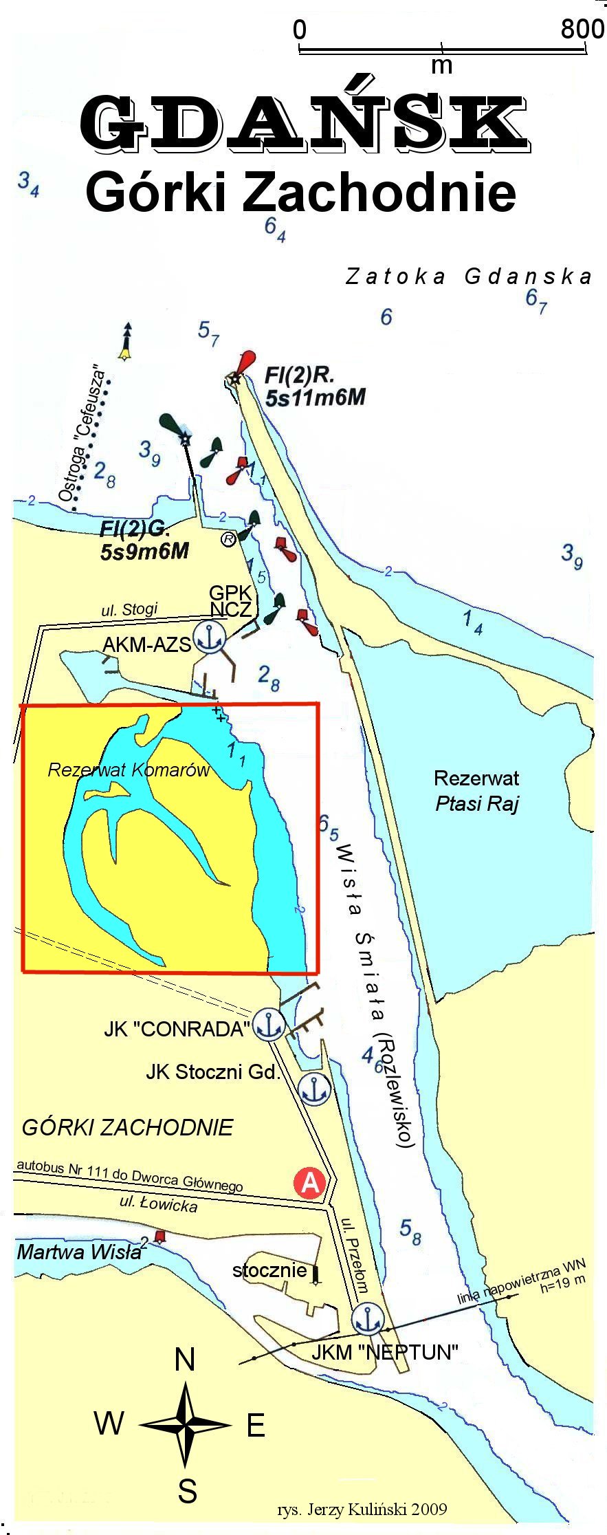 Analizując dostępne dokumenty, ciąg zdarzeń i decyzji doszedłem do wniosku, że to co dzieje się w temacie rozwój żeglarstwa w Gdańsku w żaden sposób nie zostało wymyślone przez człowieka. Pozwólcie, że aby uniknąć gadulstwa pominę takie decyzje rozwojowe, jak próba odcięcie marin od morza kładką na Motławie, plany usunięcia PKM z Twierdzy Wisłoujście itp. Opiszę ostatnią próbę blokowania przez kosmitów miejsca, które od wielu lat jest uznane przez władze miasta, Urząd Morski i samych żeglarzy jako idealny teren pod rozbudowę tak potrzebnych miejsc postojowych dla jachtów i motorówek. Myślę tu o zachodnim brzegu Wisły Śmiałej pomiędzy YKPO a AKM. Przebudowane parę lat temu ujście Wisły Śmiałej uczyniło z niej prawdziwy akwen schronienia przed złą pogodą na Zatoce, a kilka klubów żeglarskich z najnowszym NCŻ to spokojne miejsca postojowe. Wisła Śmiała to również punkt startowy dla jachtów śródlądowych na trasy Pętli Żuław, Zalew Wiślany, Kanał Elbląski, Wisłę.