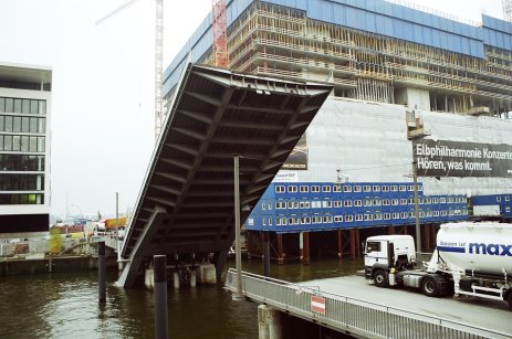 Na zdjęciu „kładka” w Hamburgu na Sandtorhafen z prawej strony buduje się kilkunastopiętrowa filharmonia.