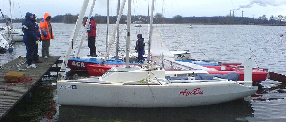 Nie tylko Krzysztof Tuz i Stanisław Skory żeglują zimą. Klasa „ZAGLE 500” w ilości 4 jachtów ( z Białegostoku „AGI-BU”, z Gdańska „CORS”, z Malborka „Q_SERVICE” i z Poznania „TORPOL”- razem 11 żeglarzy), wybrała się na tradycyjne już XV Regaty Barbórkowe do Pątnowa koło Konina. Przejechaliśmy z łódkami razem tam i z powrotem ok. 2300 km, żeby pościgać się na „ciepłym” jeziorze. Lekki mróz -1˚C i drobny śnieg „zalodził” pokłady i usztywnił szoty. Po uroczystym otwarciu wraz z 30 jachtami w pozostałych 7 klasach ruszyliśmy na wodę.