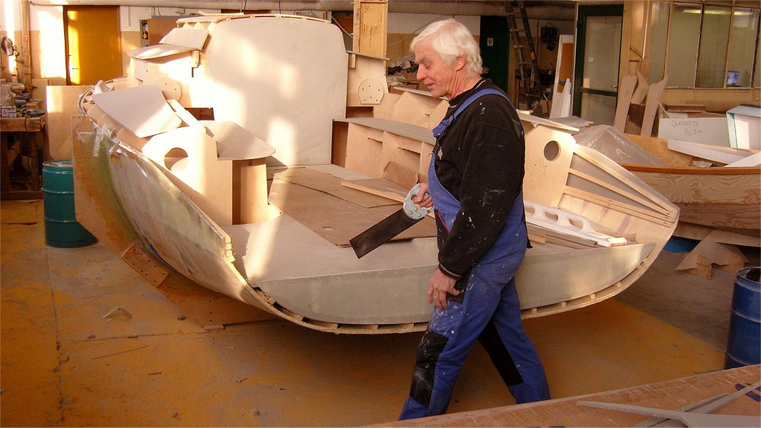 Pojechałem tam z Marianem Lenzem. Tak się złozyło, że kiedyś wszycy trzej skończyliśmy szkołę tej samej specjalności w odstępach po 10 lat. Piotr z właściwym mu niegasnacym zapałem pokazywał nam swój nowy jacht w stanie zaawansowanej budowy. Nowe pomysły, konstrukcja sandwiczowa, czyste połączenia, oryginalna jednostkowa technologia, doskonałe materiały i pełne wykorzystanie doświadczeń uzyskanych przy budowie wielu poprzednich łódek regatowych. Chyba tradycyjna nazwa.