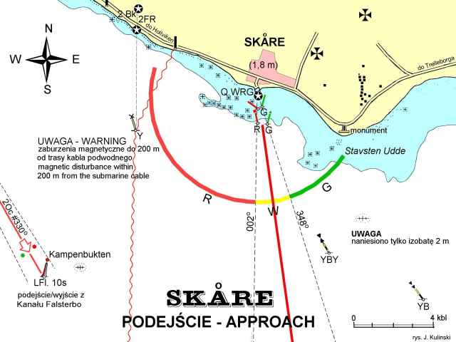 Podejscie łatwe za dnia i nocy. W nocy światło sektorowe, ale uwaga - po zachodniej stronie sektora podejsciowego - nieprzyjemnie wyglądajace głazy.
