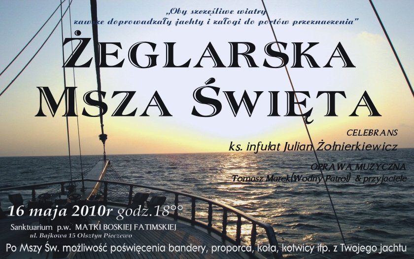 drugi raz wiosną przed rozpoczęciem sezonu żeglarskiego podejmuję próbę zorganizowania Mszy Świętej w intencji szczęśliwych powrotów (jak na plakacie), a pomysł wziął się stąd, że w 2008 roku, przed pierwszym wodowaniem mojego jachtu poprosiłem naszego księdza o poświecenie utensyliów żeglarskich takich jak koło ratunkowe, bandera i kotwica.