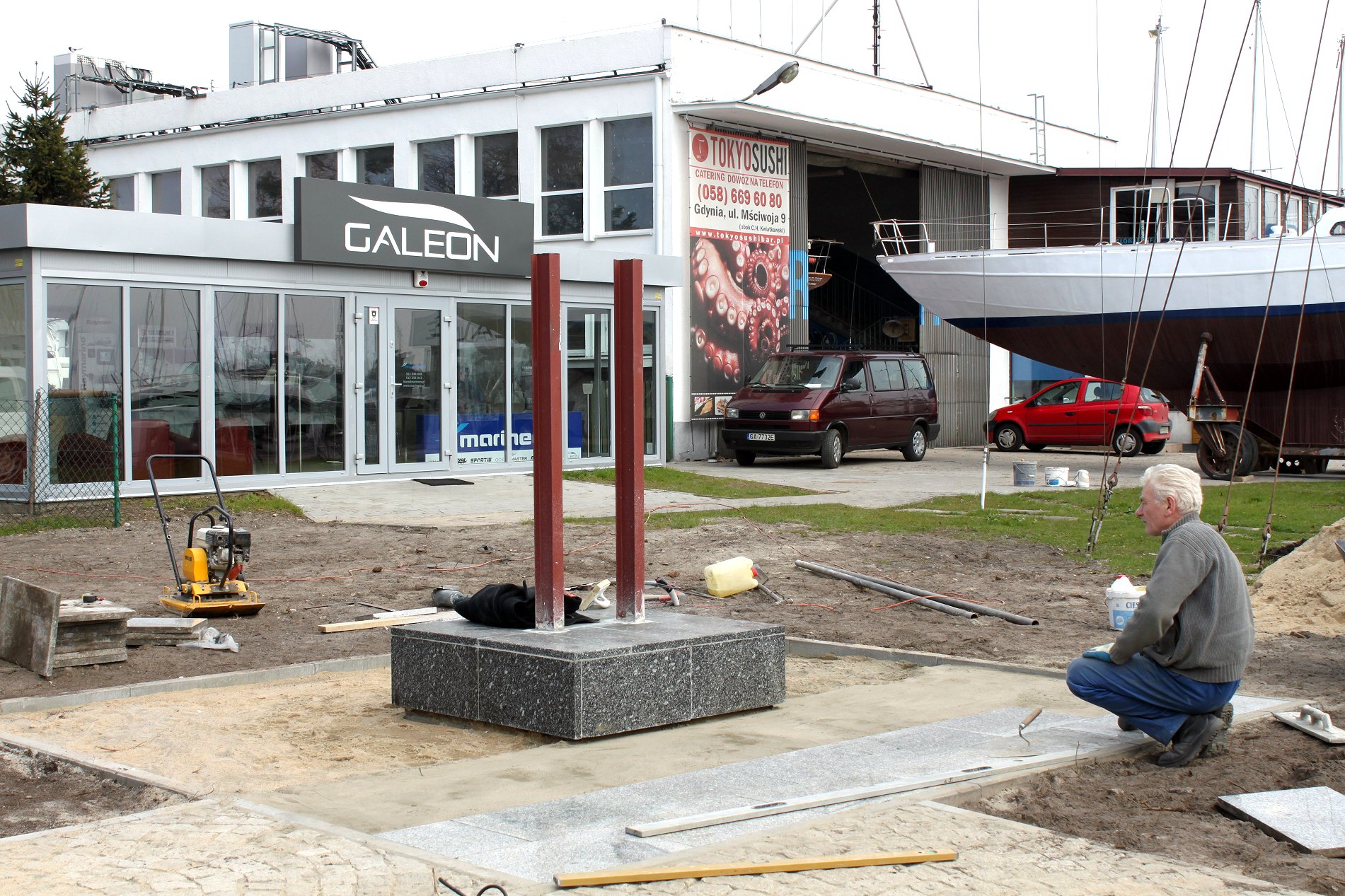 Przy okazji zlustrowałem stan Basenu Żeglarskiego im. Zaruskiego i odwiedziłem Przyjaciół. Podczas spaceru sfotografowałem przygotowania do ustawienia prawdziwego pomnika Leonida Teligi przed jego macierzystym jachtklubem, czyli "Gryfem". Okreslenie już nie za bardzo precyzyjne, jako ze Teliga stać będzie raczej przed .... "Galeonem", którego własciciel chyba nie wierzy w rychłą likwidację gdyńskich budunków klubowych.