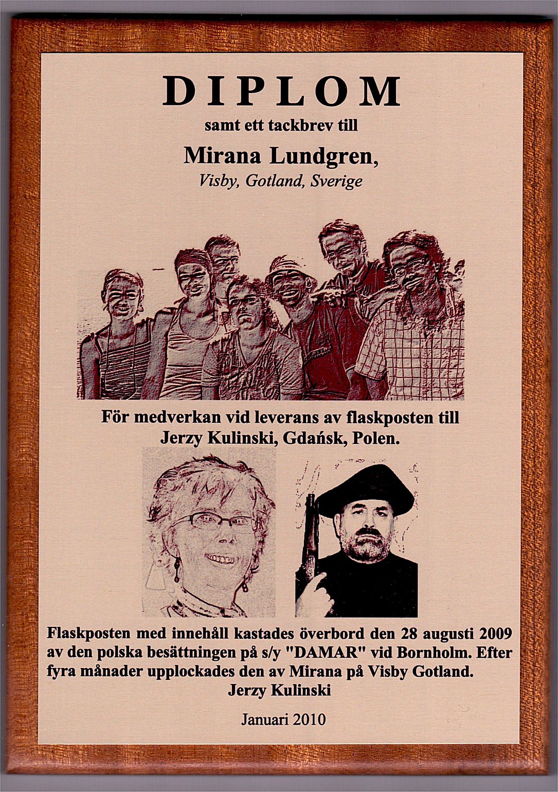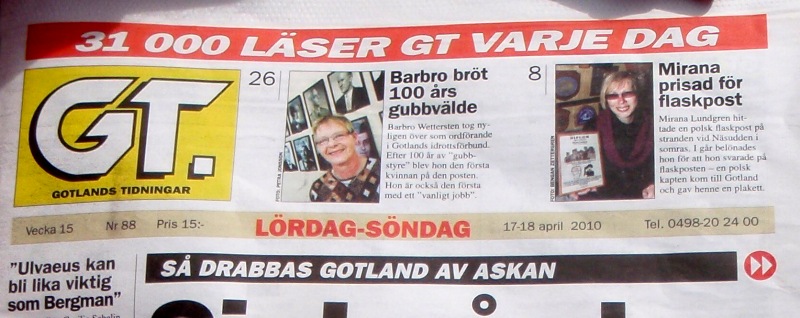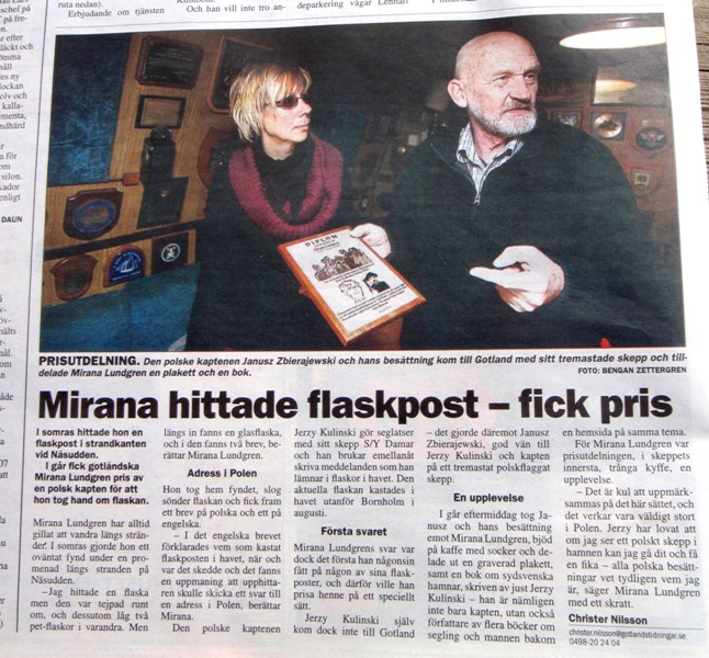 MIRANA ZNALAZLA POCZTE BUTEKLKOWA I ODEBRALA SWOJA NAGRODE - w lecie u.r. Mirana Lundgren znalazla poczte butelkowa na plazy w Näsudden. A wczoraj Mirana z Gotlandii odebrala nagrode z rak kapitana polskiego zaglowca. Mirana zawsze lubila spacerowac wzdluz plazy Näsudden i w lecie trafila na niespodzianke. Byly nia oklejone tasma dwie flaszki PET (plastikowe) a w nich szklanna butelka z dwoma listami.