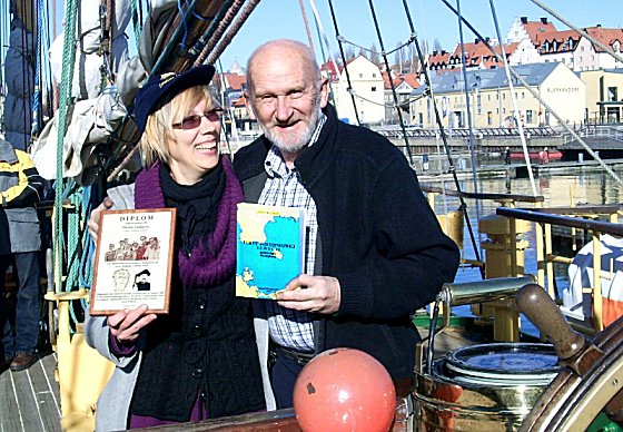 PRZEZYCIE: Wczoraj po poludniu kapitan Janusz wraz z zaloga przyjeli Mirane na pokladzie. Ugoscili Ja kawa z cukrem, wygrawerowana plakietka i ksiazka p.t. "Porty poludniowej Szwecji" napisana przez Jerzego Kulinskiego. Jerzy jest nie tylko kapitanem, ale rowniez autorem ksiazek o tematyce zeglarskiej i autorem strony internetowej o tej tematyce.