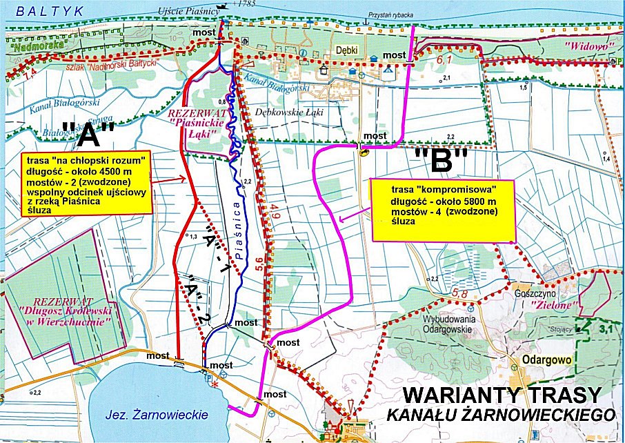 Tu dowiaduję się, że już pojawiły się kłopoty ze strony .... tak, tak, oczywiście - etatowych obrońców przyrody. Zanim podjąłem decyzję o przeprowadzeniu "wizji lokalnej" - przestudiowałem topografię na mapie o skali 1:50 000. Specjalnie interesował mnie przebieg rzeczki Piaśnica Dolna - odprowadzającej wodę z Jeziora Żarnowieckiego do morza. Zwróciłem uwagę na bardzo mały spad, na nisko położone tereny po obu brzegach, a zwłaszcza na meandry koryta w 2/3 długości rzeczki. Nie bez znaczenia jest, że zachodni brzeg meandrującego koryta ma status rezerwatu "Piaśnickie łąki". To mi wystarczyło, aby uznać, że przynajmniej tego odcinka koryta Piaśnicy Dolnej na kanał przebudować się nie uda.