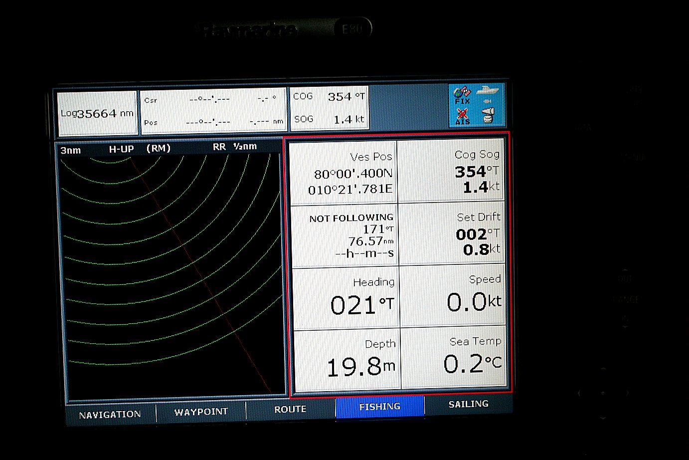 Chcieliśmy dopłynąć na 80 stopień szerokości. Okazało się tam, że oprogramowanie plotera tak wysoko nie sięga (jak widać na zdjęciu koła od radaru rozpłaszczją się o górną krawędź ekranu). Z Longyearbyern wróciliśmy samolotem. Nie jest to więc tak daleko - niecałe 4 tygodnie do Szpicbergenu plus ponad tydzień zwiedzania na miejscu.