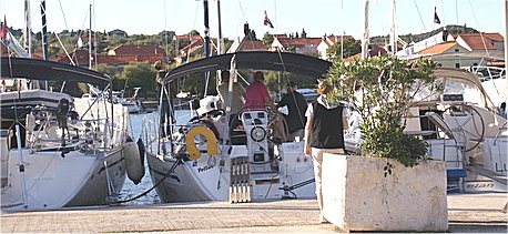 Obsługa marin przyjemna, cumowanie na „sandwicza” dobijamy do wolnego miejsca wskazanego przez obsługę portu. Bosman podaje muring i odbiera cumy – i nie wyciąga ręki po kasę, a dokumenty jachtu odbiera wtedy kiedy łódź ma zrobiony klar portowy. Ceny marin kosmos (w porównaniu z Bałtykiem) od 45-do 55 euro. Przystanie czyste, zadbane, ciepłej wody do woli. Atmosfera w portach przypomina mi to co się dzieje w Sztynorcie, czy w Mikołajkach. Cumując burta w burtę trudno zachować „sterylną” prywatność. Niemcy tak przestrzegający ciszy w swoich portach, na Chorwacji zachowują się dosyć swobodnie – imprezy na pokładzie, grill na kei, balanga nierzadko do wczesnego rana. Dużo Polaków, ale też zdarzały załogi irlandzkie, angielskie.
