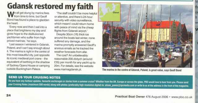 Paweł Pawlicki przysłał mi skan notki, która ukazała się w bardzo przeze mnie cenionym brytyjskim czasopiśmie PRACTICAL BOAT OWNER. Paweł pisze, że to bardzo miłe jak Anglicy (akurat nie wiem czy autor jest Anglikiem, a nie np. Walijczykiem) nas chwalą. Mnie się jednak wydaje, że im najbardziej podobają się nasze ... ceny. Tak, jak mnie się nie podobają opłaty portowe w ukochanej przeze mnie Skandynawii. Zresztą nieważne - to tak, jak w piłce nożnej. Nie ważne jak grali, grunt, ze wygrali. A więc PBO pochwalił Marinę Gdańsk. Szkoda, że nie zawinęli do mego Klubu :-) Pawłowi dziękuję, że nie zmarnował tego newsa.