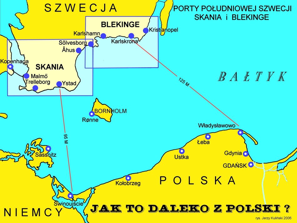 Czy płynąc do portów polskich? Polska to piękny kraj ale polskie wybrzeże ma dwie wady z punktu widzenia początkującego skippera. Po pierwsze wejścia do portów są stosunkowo niebezpieczne, łatwo jest o warunki wykluczające możliwość wejścia i łatwo dać się „zamurować” w razie gorszej pogody. Jest to szczególnie ważne, jeśli pływamy na małym jachcie i z niekoniecznie „zawodową” załogą, wchodzenie pod presją ucieczki przez ciężkimi warunkami do większości polskich portów potrafi skończyć się tragicznie. Druga słabością większości polskich portów jest nie najwyższy ich standard. Dotyczy to zarówno współpracy ze służbami portowymi, jak bezpieczeństwa i komfortu postoju, dostępności usług niezbędnych żeglarzom, a nawet braku ciszy i spokoju. Pod tym względem w portach szwedzkich, duńskich i niemieckich jest dużo lepiej, znaczna ich cześć ma także bezpieczniejsze dla małych jachtów wejścia.