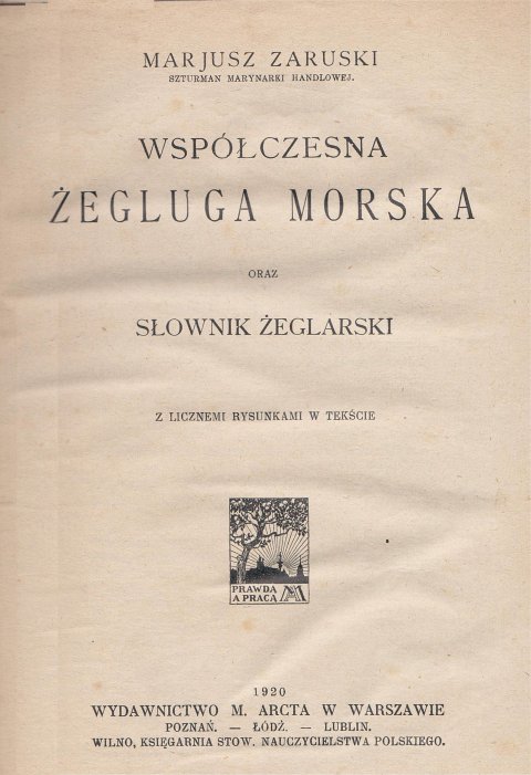 Na targach "Wiatr i Woda" zostałem obdarowany starodrukiem z 1920 roku. Jest to oryginalna książka Szturmana Marynarki Handlowej Marjusza Zaruskiego pt. WSPÓŁCZESNA ŻEGLUGA MORSKA". Wydawnistwo M. Arcta w Warszawie. W książce także słownik żeglarski. No i wreszcie mamy najstarszą polską definicję jachtu - "statek lekki z wielkimi skośnymi żaglami, jedno lub dwumasztowy. Zwykle służy do wyścigów żaglowych i przejażdżek. Także lekki parostatek do tychże celów". A szyper to "kapitan żaglowego okrętu". Natomiast szturman - "oficer załogi, pomocnik kapitana, który robi obliczenia tyczące żeglugi. W ogóle - posiadający świadectwo złożenia egzaminów żeglarskich, dające prawo samodzielnego prowadzenia okrętu i objęcia stanowiska kapitana"