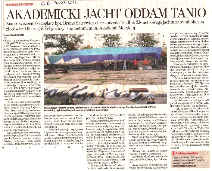 Dwa tygodnie temu w "Gazecie Wyborczej"  pojawił się artykuł o jachcie, którego nikt nie chce. Z artykułu dowiedziałem się że w sprawę zamieszany jest dobrze znany Czytelnikom SSI - kpt. Bruno Salcewicz - skiperujący teraz na zabytkowym "Polonezie". Bruno jak wiecie jest niepoprawnym entuzjastą i pewnie już sobie wyobraża, że napewno znajdzie dla jachtu armatora.
