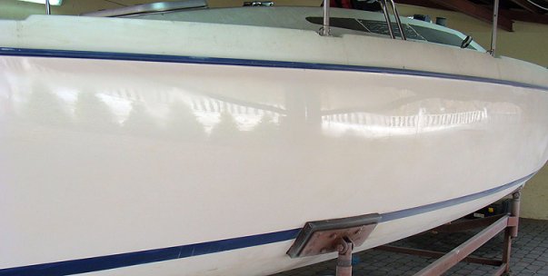 Potem następuje proces polerowania. W pierwszym etapie tarczą z wełny owczej ( jakby grubsza obróbka). Na tarczę nanosimy pastę ( jakieś trzy porcje tego co nakładamy na szczoteczkę do zębów). Piszę o tym ponieważ miałem kłopoty i znowu po konsultacji z firmą okazało się, że nakładam zbyt dużo. Wybieramy fragment powierzchni do polerowania ( jakieś 0,5 m2) i zaczynamy. Zaczynamy od niższych obrotów, aby rozprowadzić pastę na powierzchni a potem zwiększamy obroty i dużymi, okrężnymi ruchami polerujemy. Unikamy polerowania w jednym miejscu przez dłuższy czas, aby nie uszkodzić żelkotu. Po zrobieniu całego kadłuba zaczynamy proces końcowy tarczą z wełny jagnięcej. Identycznie...i zobaczmy efekt końcowy.