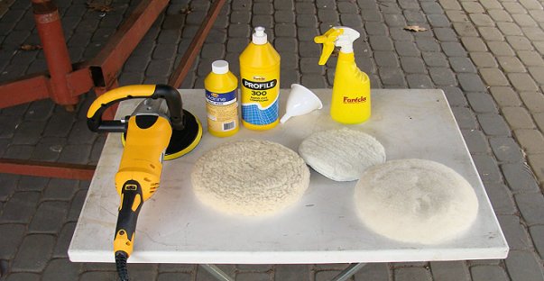 Zaopatrzyłem się więc w polerkę ( najtańsza 250 zł i sprawdziła się doskonale) tarczę z wełny owczej i tarczę z wełny jagnięcej, ponadto papier ścierny P400, P600 i P1200. 1 L Profile 300 i butelkę Marine Clear. Ten spryskiwacz służy do nanoszenia roztworu Marinera z wodą na powierzchnię jachtu.