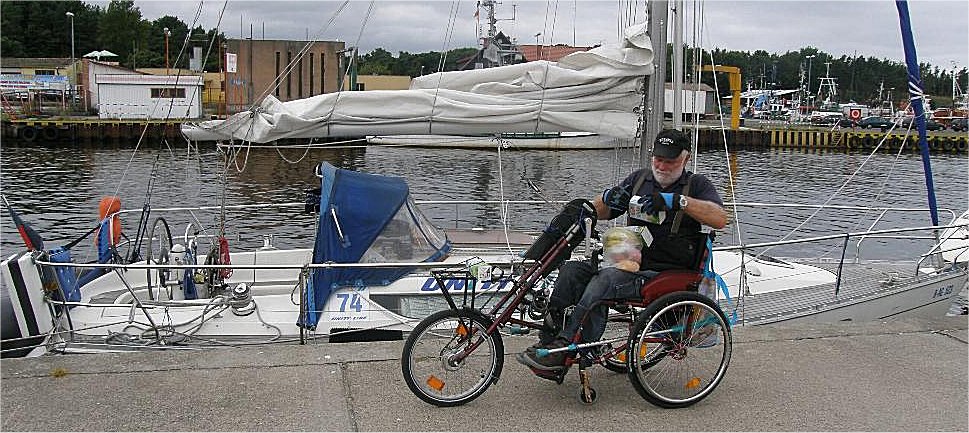W usteckim porcie tłok. Ze swojej HOLLY zauważyłem, że po wschodniej stronie portu stoi jacht SEBA z Ralfem Pritzkowem - samotnym żeglarzem, który chociaż na lądzie porusza się na wózku inwalidzkim, to na morzu obsługuje 10-metrowy jacht. Znamy się, bo stale startujemy w grupie samotnych na regatach UNITY LINE. Oczywiście odwiedziłem go. Wraca z Gdańska, bo tradycyjnie przed regatami robi sobie rejs po polskich portach.