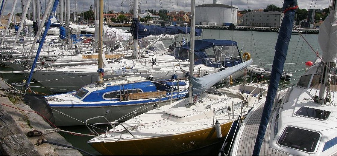 "Holly" (to niebiesko-białe maleństwo) dziobem do nabrzeża falochronowego w Visby.