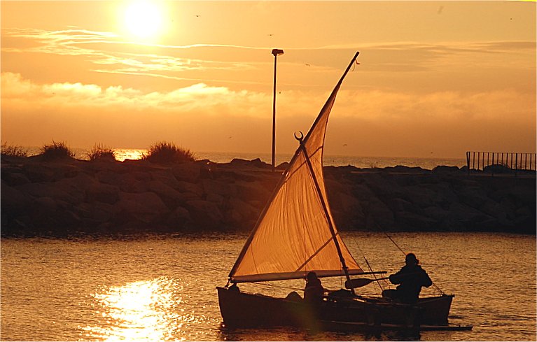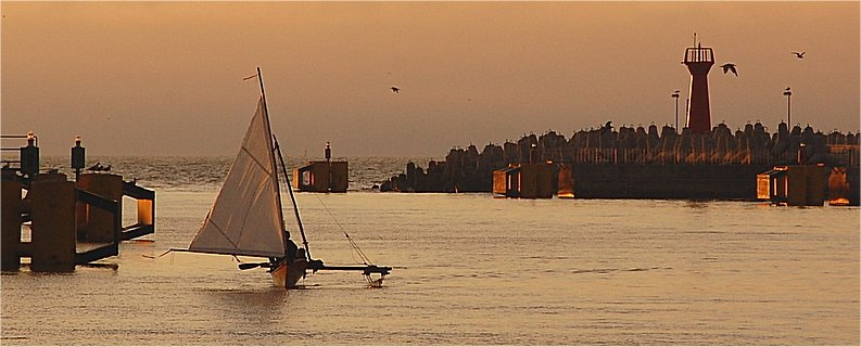 Konieczność powiązania łodzi, problemy ze znalezieniem kanału i przenoską przez jego zasypaną część powodują, że "Tavau" na Bałtyku ląduje dopiero około godziny 1400. Ale jest. Dostaję informacje, że przybój opanowany, a Proa z wiatrem 2-3B z kierunków wschodnich dość skutecznie kieruje się w stronę Kołobrzegu. Na tyle skutecznie, że o zachodzie słońca w gasnącym wietrze załoga melduje się w remontowanym porcie, gdzie wszyscy byliśmy goszczeni przez Grzesia Sulimki, któremu serdecznie dziękujemy zarówno za opiekę jak i późniejsze, nadsyłane na bieżąco prognozy.