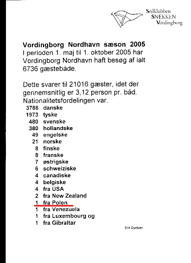 Wiele problemów poruszanych przypomina dyskusje wąskiej grupy zapaleńców (niestey do niej również ja należę) którzy chcą żeglawać po naszym morzu. Przyzwyczaiłem się do tego że w czasie 3 tygodniowego rejsu po Bałtyku spotykam jeden góra dwa polskie jachty. Na poparcie mojego stanowiska załączam zestawienie jachtów odwiedzających port Vordingborg w Groensundzie (napewno tam byłeś.