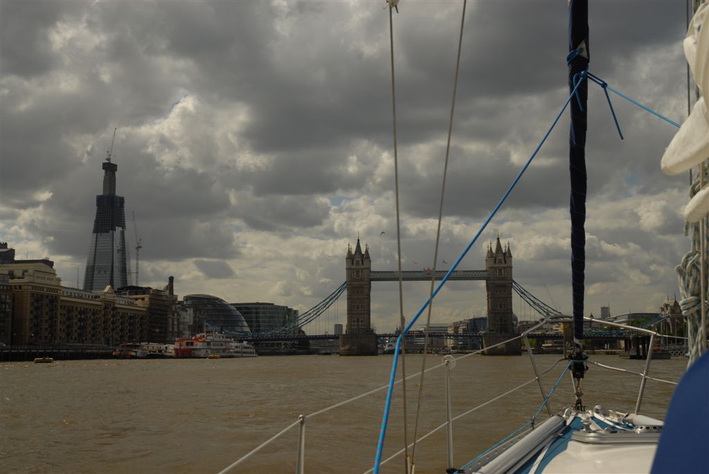 Następnego dnia prąd zmieniał się na zachodni około 0800 rano, więc zabraliśmy się z nim do Londynu (około 45 mil), gdzie byliśmy o 1700. Żegluga Tamizą przypomina płynięcie kanałem portowym od Westerplatte do mariny w Gdańsku, tylko jest jeszcze brzydziej. Ruch nieduży. Jechaliśmy na gieni z wiatrem 6 B, na zakrętach pomagając sobie silnikiem. W sumie nudna droga. W Londynie stanęliśmy w Limehouse Marina, bo w słynnym Saint Katherine Haven nie było już wolnych miejsc. Płynąc do Londynu warto zaplanować przybycie z wysoką wodą, bo śluzy na wejściach do marin działają tylko przez 2 godziny przed i po wysokiej wodzie przy London Bridge.