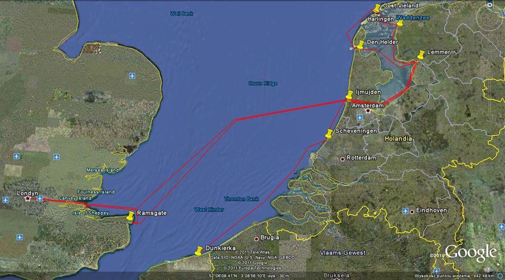 Na przełomie maja i czerwca znów przyjechaliśmy z Mikołajem do Lemmer i tym razem postanowiliśmy odwiedzić Londyn. Mieliśmy tylko 10 dni, więc nie było czasu na wyczekiwanie na dobrą pogodę i korzystne prądy. IJseelmeer i Markermeer przeszliśmy na silniku, przespaliśmy się przycumowani pod mostem przy Oranjesluizen pod Amsterdamem i rano wyszliśmy w morze przez IJmuiden. Z wiatrem 4-5 B, rosnącym na 6-7 B z NE i postępującymi od wschodu opadami deszczu pojechaliśmy w stronę Anglii. Na początku płynęliśmy 60 mil kursem 260° (trzeba było ominąć strefy rozgraniczenia ruchu pod Rotterdamem, który podobno jest największym portem w Europie, więc ruch statków jest bardzo duży), a potem odpadliśmy na kurs 220°, którym szliśmy kolejnych 80 mil w stronę Ramsgate. W drodze do Ramsgate trochę nas wykolebało, bo wychodziliśmy w springu i prądy osiągały po 2,5 wezła, co powodowało obrzydliwą falę, gdy wiatr wiał pod prąd.