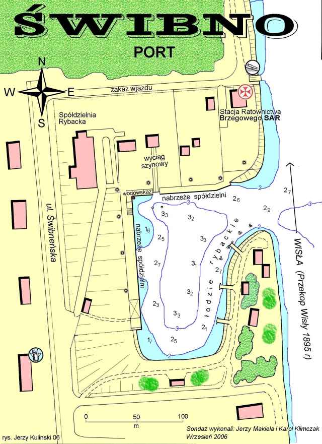 Niedawno oglądaliście w tym okienku fotografie portu Świbno. Teraz podrzucam jego planik. Wydrukujcie go sobie, najlepiej na kolorowej drukarce. To okazja, bo plan tego portu śmiało można nazwać ... unikalnym. Dwa tygodnie temu, podczas inwentaryzacji portu zraniłem sobie rękę i przeszła mi ochota na wykonanie sondażu. Napisałem mail do Jurka Makieły z pytaniem czy nie zechciałby wykorzystać taka piękną jesienna pogodę (wycieczka do Świbna). Chciał, co nie było dla mnie niespodzianką. Popłynelim tam "rybą" we dwóch, czyli Jurmak z Karolem Klimczakiem. No to  już macie komplet nawigacyjnej informacji - plan z sondażem. Skompresowałem obrazek do 60 KB. Powinien być czytelny. W drugim wydaniu ZATOKI GDAŃSKIEJ, będzie ostry jak żyletka, ale na książkę jeszcze trochę musicie poczekać.