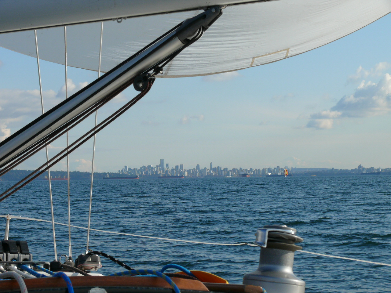 Podobno nawet przy byle jakim wietrze na wodzie przyjemniej niz za biurkiem w pracy. Chociaz na szczytach gor juz pierwszy snieg, w Vancouver nadal sie plywa.