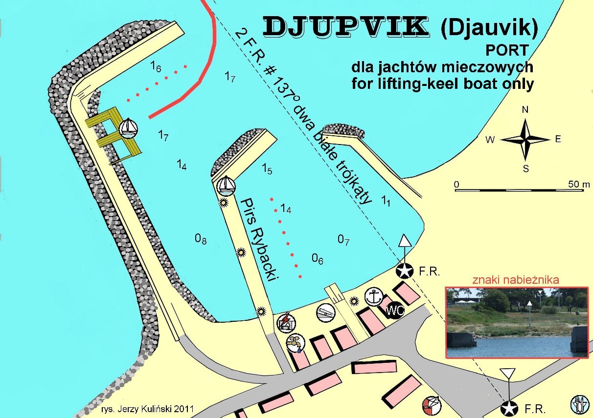Podejście. Odradzam zawijanie przy silniejszych wiatrach z N. Znalezienie portu w panoramie brzegu nie jest łatwe, ale mając na podorędziu wielki drogowskaz w postaci Małej Karli – sprawa jest banalnie prosta. Od środka wyspy namiar na port Djupvik – wprost na wschód. W odległości około 0,5 mili starajcie się podchodzić prostopadle do brzegu – jednocześnie bardzo pilnie wypatrując nabieżnika krk 137º. Jest to para białych trójkątnych tarcz. Znak przedni w linii brzegowej, wewnątrz portu – znak tylny na pagórku za portem. Za tym znakiem widoczny jest spory, biały pawilon pensjonatu. W nocy linię nabieżnika wyznacza para czerwonych świateł stałych. Na głowicach falochronów żadnych znaków nawigacyjnych nie ma. Nie są one też podświetlone. □