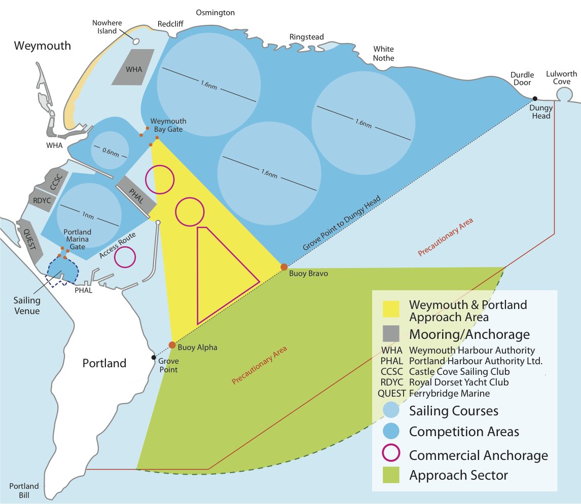 Tak samo chcę Was zniechęcić do odwiedzin w powyższych terminach w Weymouth, które gości wszystkie konkurencje żeglarskie. Chyba, że jesteście skłonni płacić 18 funtów za metr za 24 godziny postoju. W trakcie Igrzysk Paraolimpijskich - 5 funtów za metr za 24 godziny (to wszystko dla jachtów do 15 metrów LOA). Kotwicowisko, znajdujące się obok jednej z wyznaczonych tras regatowych - to koszt 10 funtów za metr za taki jacht, więc niewielka oszczędność, a bączka będzie można średnio używać (mają być pewne restrykcje). Popatrzcie na mapkę (ściągnieta ze stron Portland Port Authority) - kotwicowisko o którym mowa to ciemnoszary prostokąt oznaczony skrótem WHA (Weymouth Harbour Anchorage). Niewiele stamtąd będzie widać, minimalne odległości do granicy stref regat są rzędu 100 m, a od kotwicowiska 200-300 m jak zajmiecie dobre miejsce. Lepiej popłyńcie do Plymouth czy Chichester, tam zostawcie jacht a sami przyjedźcie pociągiem do Weymouth i dołączcie do zastępcy Harbourmaster'a, Alana Baker'a, który całość ma zamiar oglądać z plaży, gdzie będą ustawione tzw. Live Sites - z telebimami. A najlepiej zróbcie to co 2/3 ankietowanych przez PBO - włączając mnie*) - "I'd rather be doing my own thing on my boat, away from all the fuss". 'Tylko' 11 procent stwierdziło, że warto spróbować… to sporo, ostrzegam, tłoczno tam będzie!