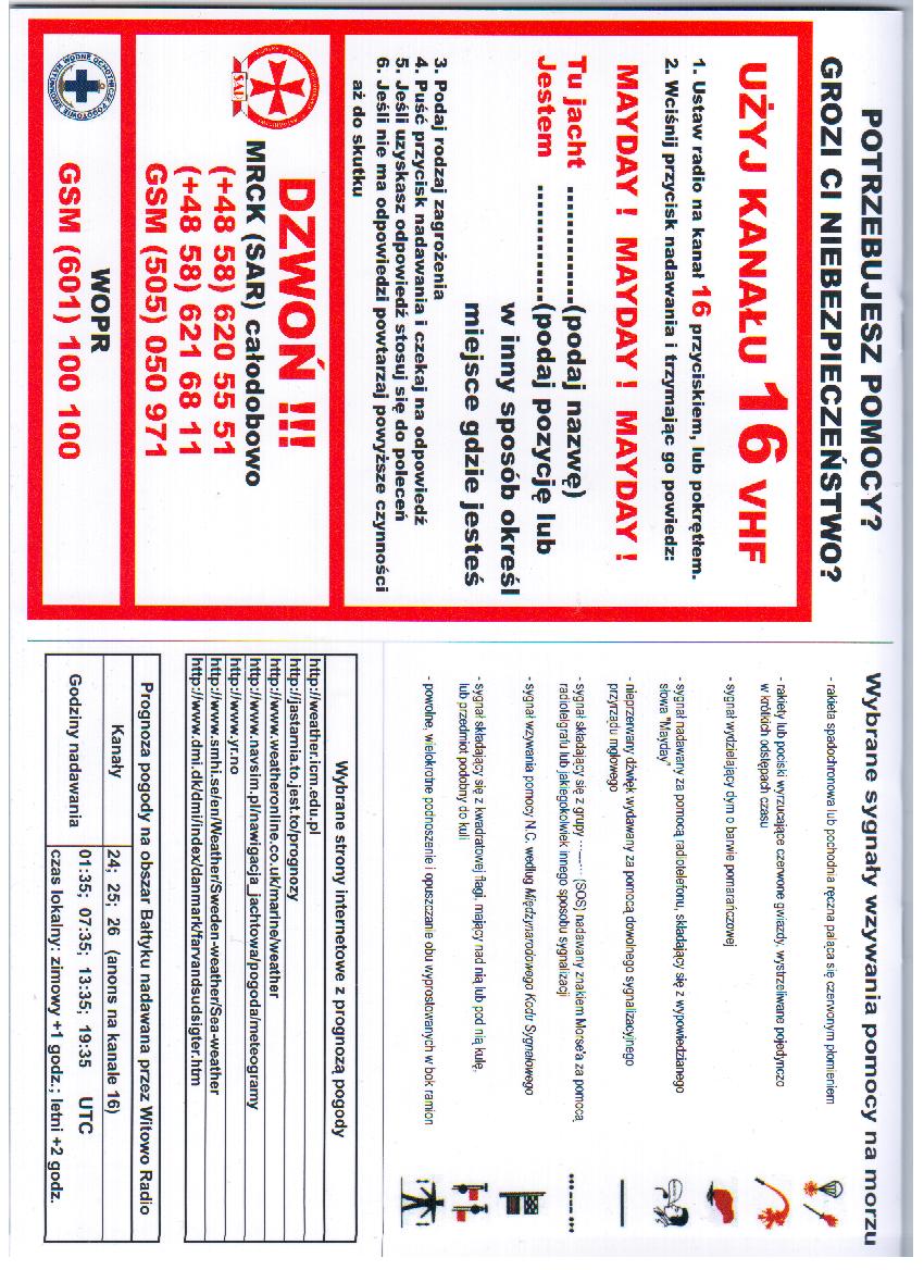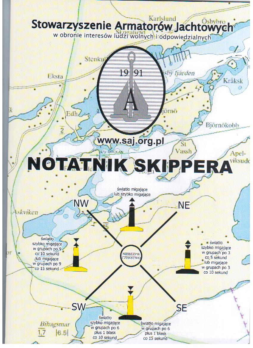 No, nie jest to taki Dziennik Jachtowy który was dręczył przez kilkadziesiąt lat. Ma też inną nazwę - NOTATNIK SKIPPERA. Oczywiście nie ma niebieskiej okładki, jest naprzwdę przyjazny i na dodatej NIC NIE KOSZTUJE. Mówią, że nie ma lunchu za darmo. To prawda - złożyli się na jego wydanie członkowie Stowarzyszenia Armatorów Jachtowych. Tak, tak - sfinansowano go z tych skromnych, pięciozłotowych składek SAJ. Na okładkach (poniżej) po zewnętrznej i wewnętrnej stronie dużo praktycznych ściąg dotyczących bezpieczeństwa żeglugi.