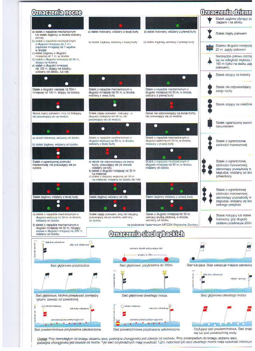 1. Nocne oznaczenia lewej i prawej burty umieścić jedno pod drugim a w uzyskanym miejscu umieścić flagę „A” MKS z opisem „mam nurka pod wodą lub pilotuje długodystansowego pływaka”