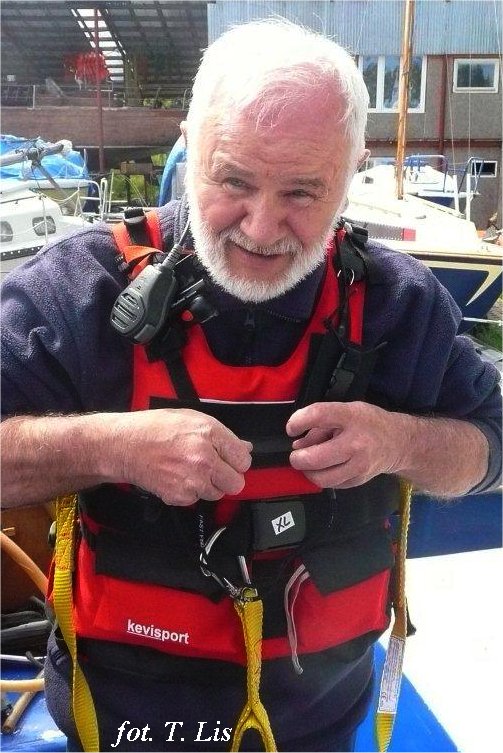 f) Pływające, bardzo lekkie radio z wodoodpornym mikrofonem i baterią o podwyższonej pojemności. Eksperci z KEVISPORT dopasowali mocowanie gruszki tak, że nie tylko jest ona wygodna w nadawaniu, ale też będąc blisko ucha zapewnia doskonałą słyszalność. Jak widać na fotografii kieszeń na radiostacje została opuszczona nieco niżej i tak uszyta, że kciukiem można łatwo uruchomić funkcję VOX. Funkcja pozwala aktywować nadawanie głosem, co jest bardzo wygodne w czasie manewrów portowych, gdy obie ręce są zajęte rumplem i manetką gazu. Często korzystam z niej na ruchliwych kanałach – na przykład w czasie podpływu do Amsterdamu lub ruchliwych podejściach do IImujden, gdzie uzgadniam własne ruchy z sąsiednimi jachtami i pchaczami.