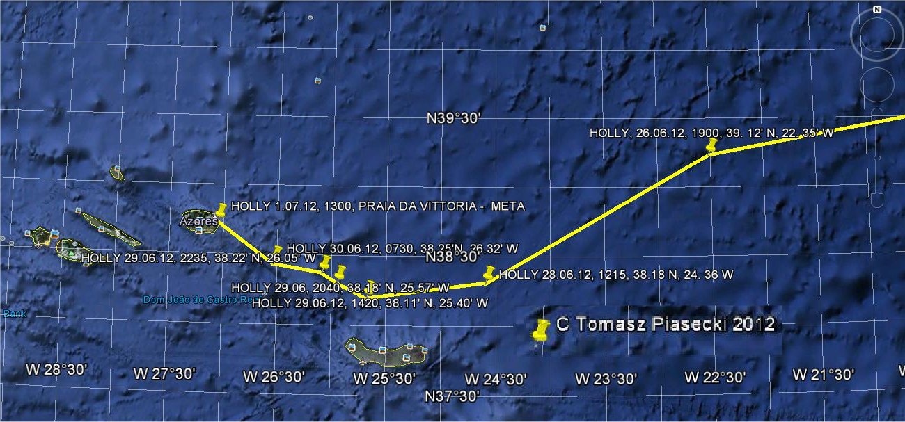 "Holly" w pełni szczęśliwa zacumowała dziś - 1 lipca 2012 do nabrzeża portu Praia da Vitoria prowadzona pewną ręką równie szczęśliwego skippera Edwarda "Gale" Zajaca. Na redzie portu uległ awarii pomocniczy napęd mechaniczny łupinki. Do portu została, podcza absolutnej flauty przyciągnięta na smyczy przez jach "Kate" - skipper Marek Tereszewski. " Złe, morskie Mzimu" prześladowało "Holly" do końca - wystawiając cierpliwość jednoosobowej załogi na ognistą próbę. Kiedy rozmawiałem z Edkiem był całkowicie owładnięty myślą o prysznicu na ślicznej 42 stopowej „Kate” – jest niedziela i port śpi pogrążony w upale. Na Edka czekał symboliczny, zielony ex-folkbot – kwintesencja Jester. Po mieście już się rozniosło, że odnalazł się Polish though guy.