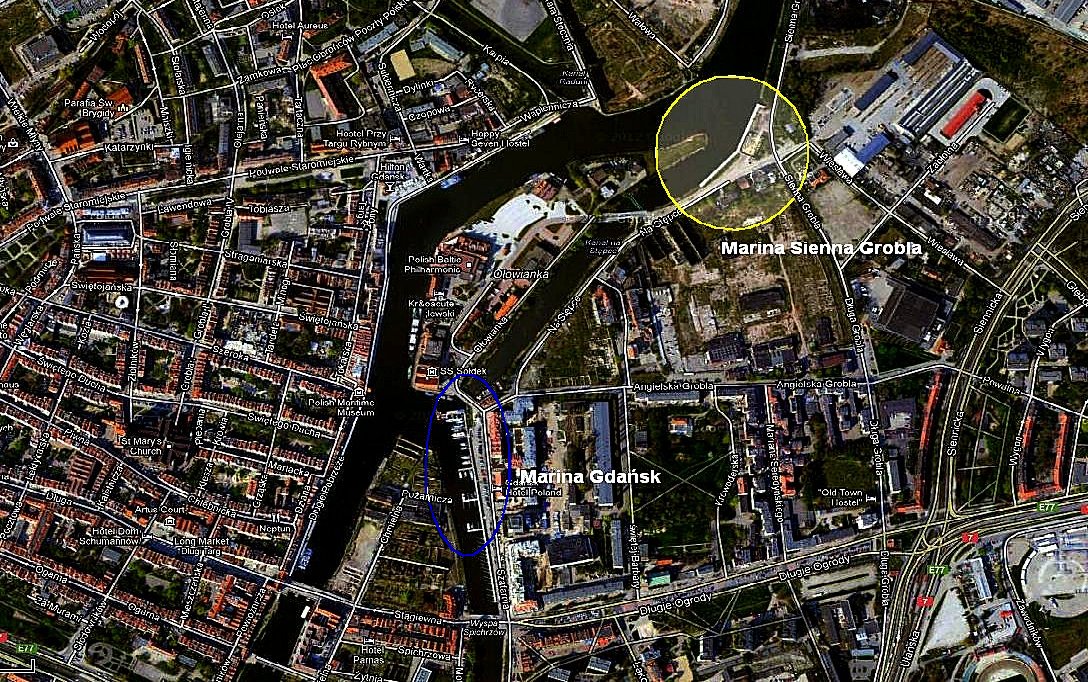 Tak mi wypadło że do Gdańska zawinąłem celem oddadnia jachtu następnej załodze (a wkrótce zawitam ponownie w celu diametralnie przeciwnym). Oczywiście w marinie koło Żurawia nie było co marzyć o wolnym miejscu więc z góry tą Sienną Groblę zaplanowałem. Po pierwsze primo - zupełnie pusto, pomimo sporego ruchu jachtów w Gdańsku. Y-bomy lub jeśli wolisz, wytyki cokolwiek przykrótkie, ale 43 stopowy jacht dało się wstawić pomiędzy nie.