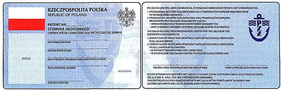 POLSKI ZWIĄZEK ŻEGLARSKI ZAŚWIADCZA, ŻE POSIADACZ NINIEJSZEGO PATENTU JEST UPRAWNIONY DO: