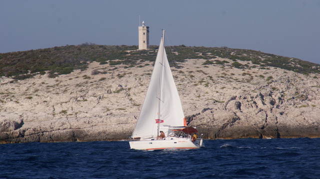 Rano wieje normalnie, a bosman nam mówi że to już koniec bory i o 10 rano będzie spokój. Wypływamy, ale targa nami dosyć porządnie. Niby wieje 12-16 węzłów, ale jak walnie to wiatromierz pokazuje 25-28 węzłów. Godzina 10 i jakby ktoś przekręcił wyłącznik, no może nie nastała cisza, jak na Solinie, lub Nidzkim koło wysp. To lewej to z prawej, to od tyłu. O 11 jakby ktoś znowu przekręcił włącznik i zaczął wiać mistral 3-4. Aby nie było zbyt fajnie to prosto w mordę. Załoga, po jednodniowym postoju twardo chciała halsować w kierunku Splitu. Ja nie byłem przeciw, bo to napęd gratis.