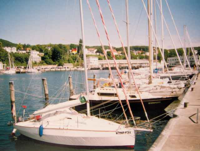 Płynę na Hiddensee to bardzo ciekawa wyspa .Królują na niej rowery i tramwaje konne, nie ma na niej samochodów a turystów jest bardzo dużo. W porcie Neuendorf stałem w tratwie na czwartego i to w miejscu gdzie był wyraźny zakaz cumowania, ale władze portu przymykały oko tylko kasowały za postój [5 euro najtaniej w Niemczech ] Bardzo wiele jachtów nie znalazło miejsca w porcie , płyneły na kotwicowisko, ja też poprzedniej nocy na nim stałem. Pływam po okolicy bardzo ostrożnie [mam mało dokładną mapę] ale rozsądek, sonda , lornetka i małe zanurzenie 60 cm pozwalają na bezpieczną dzienną żeglugę. Wspanieła pogoda , piękne wyspy, bezpieczne kotwicowiska to namiastka Tropików, ale czas upływa trzeba wracać do domu, 19 lipca zaczynam płynąć na Wschód. Mijam Arkonę, wiatr tak kręci, że mogę płynąć tylko na południe, więc cofam się do Sassnitz podziwiam z morza kredowe klify Rugii,zatrzymuję się na postój [7euro] uzupełniam benzynę, zwiedzam kredowe klify od strony lądu [robią duże wrażenie] i dalej w drogę. Przede mną najdłuższy odcinek, który pokonałem w tym rejsie Sassnitz-Ustka 120 mil 36 godzin samotnej żeglugi. Kiedy na wysokości Koszalina zobaczyłem polskie wybrzeże serce zabiło mi silniej czułem w mikro skali to co czują żeglarze po długich rejsach, gdy wracają do domu W Ustce spokojny postój,. Słyszałem negatywne uwagi otym porcie, ja ich nie podzielam, jest tu bardzo sympatycznie wspaniali żeglarze, gościnni ludzie,postój darmowy, czego więcej trzeba nie narzekajmy na drobne niedogodności.