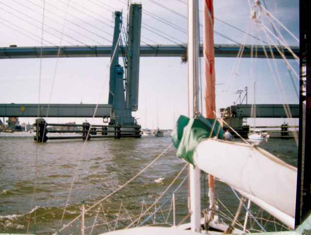 [na Zatoce Gdańskiej też ochraniano w Juracie ośrodek wypoczynkowy to chyba norma - niezależnie od ustroju ] W trzeciej zatoczce zatrzymali mnie, kiedy płynąłem kanałem na silniku miejscowi ludzie, kazali zacumować do prywatnego pomostu i zaczęli gościć. To polsko-niemieckie małżeństwo z Opola mają tu domek, jest bardzo sympatycznie i można porozmawiać po polsku. Płynę dalej do Stralsundu, czekam w marinie [6 Euro] na otwarcie mostu [ w budowie jest drugi wantowy , bardzo wysoki] . Jeżdżę po okolicy , zaskakuje mnie bardzo duża ilość jachtów, łodzi motorowych w 3 marinach i kanałach w mieście . Gdyby jachty z polskiego wybrzeża Bałtyku zgromadzić w jednym miejscu byłoby ich chyba mniej niż w jednym mieście byłej NRD. Dużo nam brakuje aby nasze przepisy nie krępowały morskiego żeglarstwa.