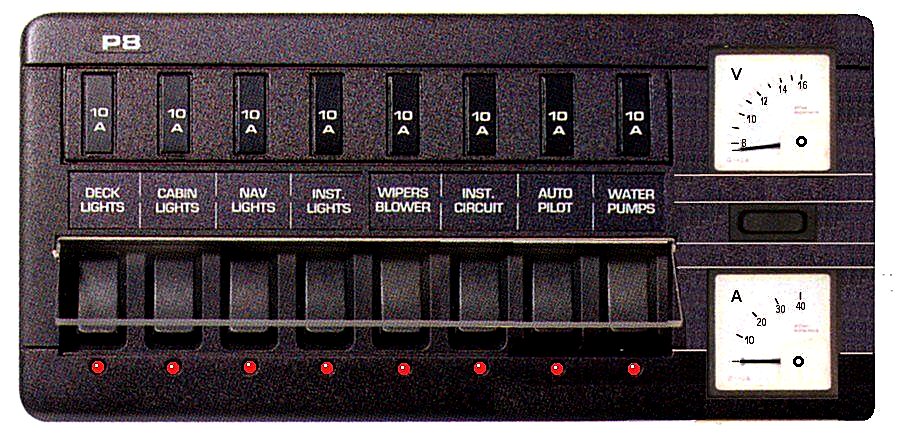 Włączniki które muszą się znaleźć na drugiej tablicy to: włącznik światła topowego (trójsektorówki) lub czerwonego nad zielonym (pamiętacie wierszyk: red over green the sailing machine?), włącznik światła silnikowego, kotwicznego (jeśli nie używacie osobnej lampy wieszanej na fale) oraz ewentualnie świateł podsalingowych (mam do nich małe przekonanie) lub awaryjnego stroboskopu (warty poważnego rozważenia na sytuację ekstremalne).